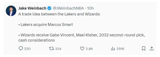 基于此,据NBA记者Jack·Weinbach投篮:湖人、奇才正在商谈一笔3换1交易。具体为湖人送出文森特、克莱贝尔、32年次轮得到马库斯·斯玛特。