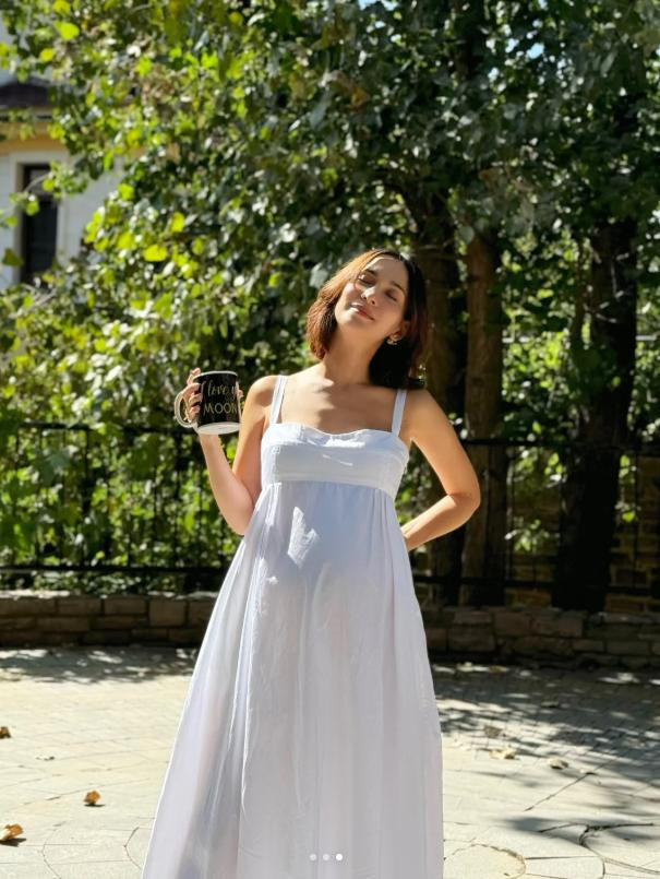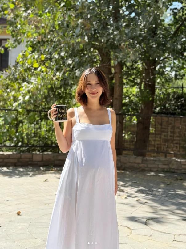 拿着一个茶杯喝茶,素颜出镜颜值依然很高,俏丽的短发搭配一件白色的吊带连衣裙是一点看不到赘肉,卢靖姗的自律真是让人佩服,不管是怀孕还是没怀孕,卢靖姗都一直坚持锻炼健身,即便是到了孕晚期,挺着大孕肚也没停止。