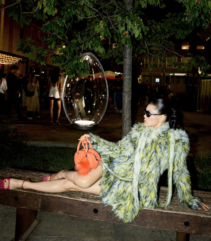 袁娅维亮相米兰时装周, 身穿绿色皮草套装, 霸气有范儿